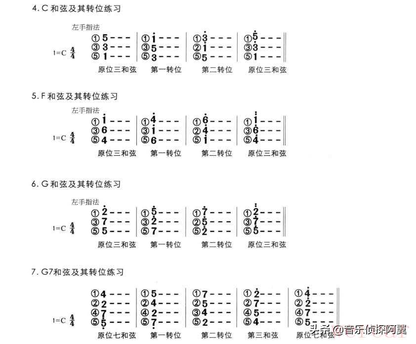 如上图所示,每一个三和弦都会分为,原位和弦,(不是原味和弦,哈哈)第一转位及第二转位三种获得方法。