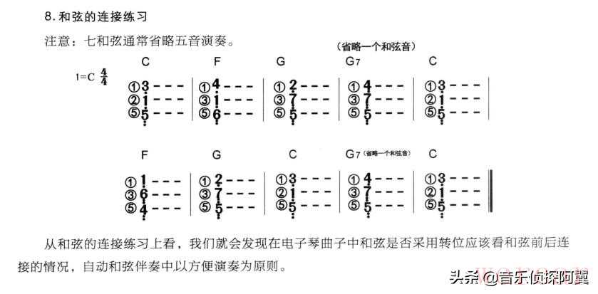 这样一来,七和弦明显就是变成了四个音的和弦,因为同时按下演奏4个音可能在和弦与和弦之间的过渡转换上造成不必要的影响,所以电子琴的智能和弦伴奏系统就被很好的利用上了。通过上面图片,我们可以清晰的看到,七和弦一般都是省略了五音成为了根三七的新格局,转位也以此类推。