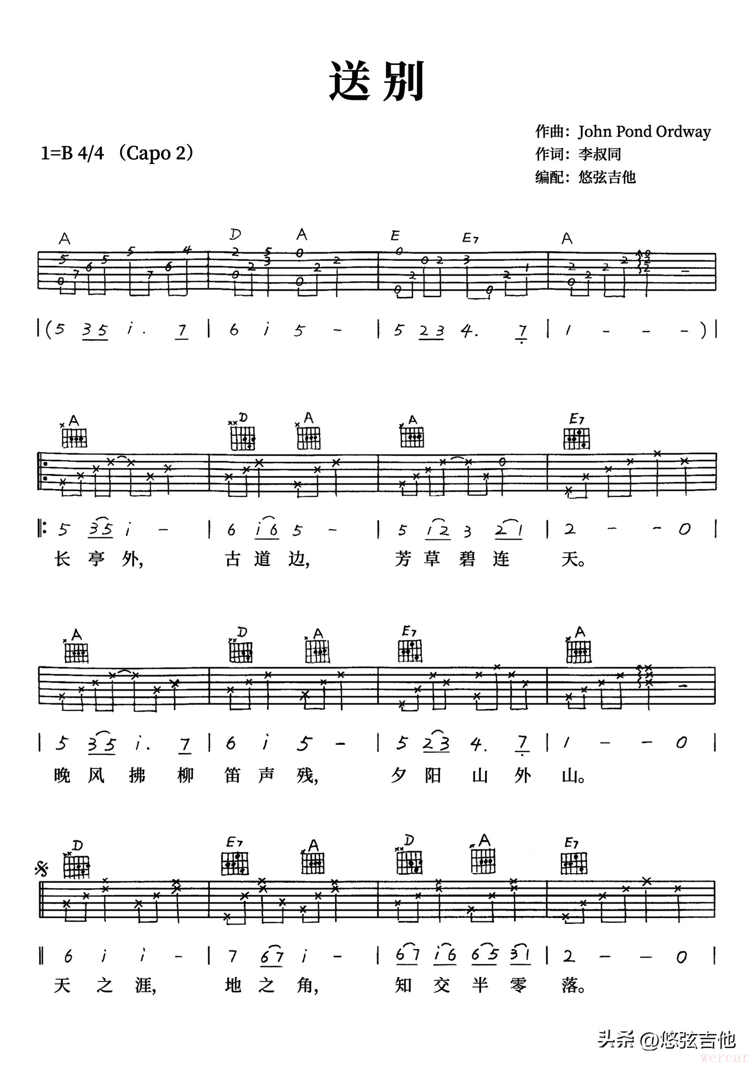 这里为您分享一首非常经典的中文歌曲《送别》的吉他弹唱曲谱。