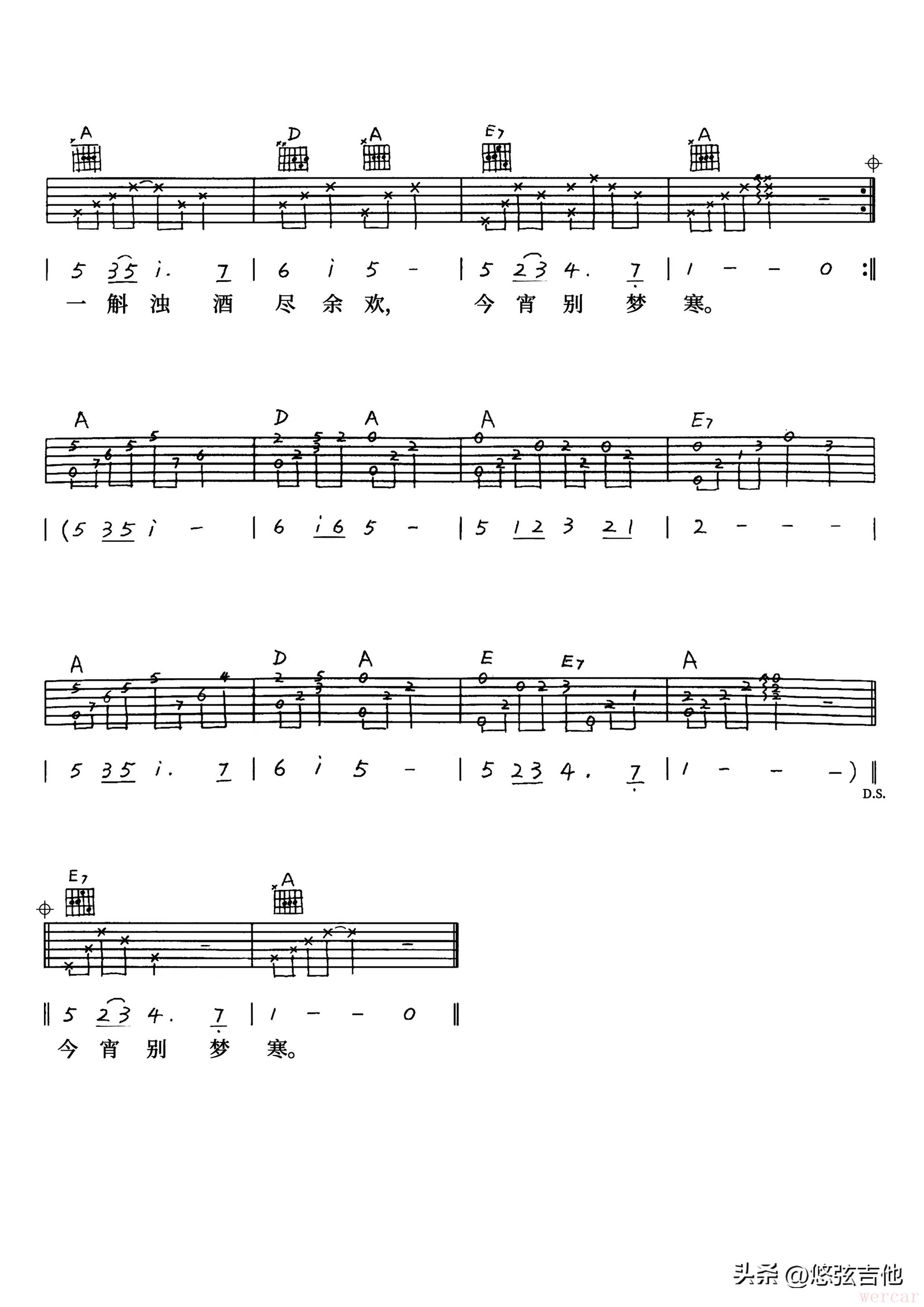 编配上采用了A调指法编配,变调夹夹在二品,以B调演唱,琴友们可以根据自身嗓音高低进行调整。伴奏和弦只用了A大调三个常用大三和弦:一级A、四级D、五级属七E7;伴奏节奏也很简单,没有一直用固定节奏型,有些随性的感觉,大家也可以根据自己的感觉进行变化。
