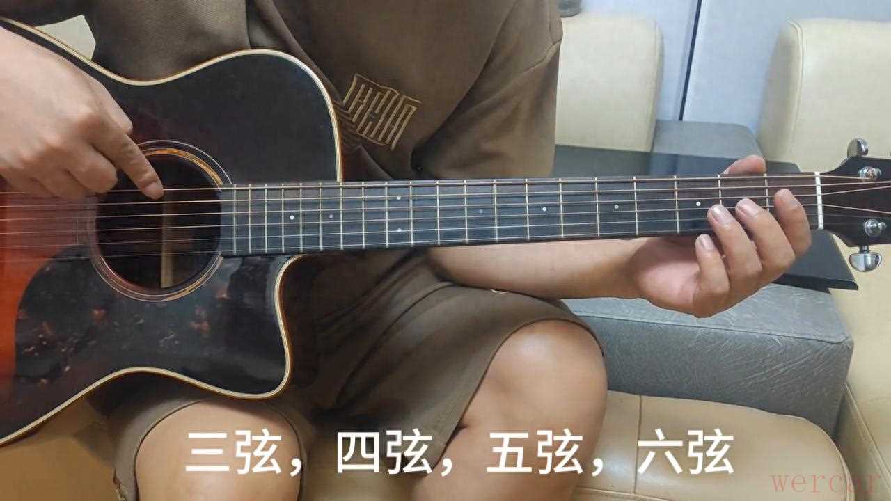 ·由下往上数,这是吉他的一弦、二弦、三弦、四弦、五弦、六弦。