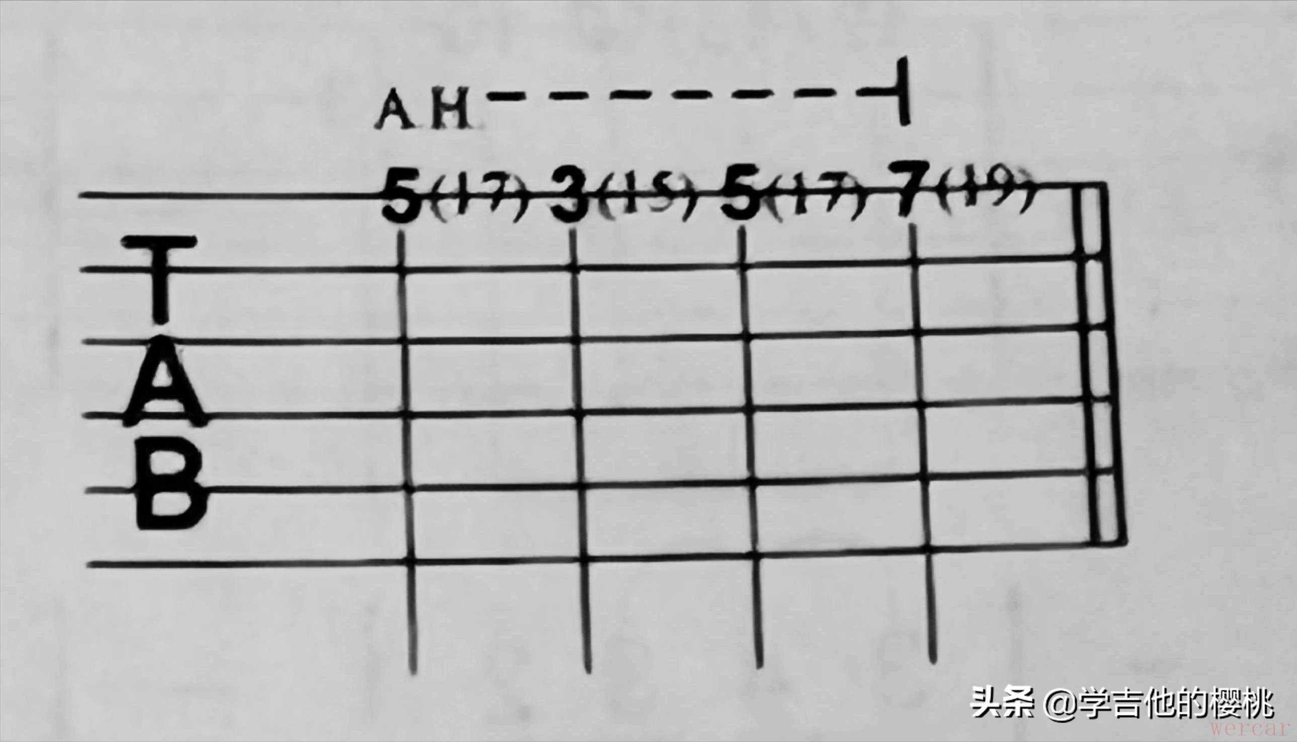 人工泛音:人为改变弦的基音而产生的泛音。人工泛音在吉他上所有音域内都可以发出泛音。标记是:A.H.