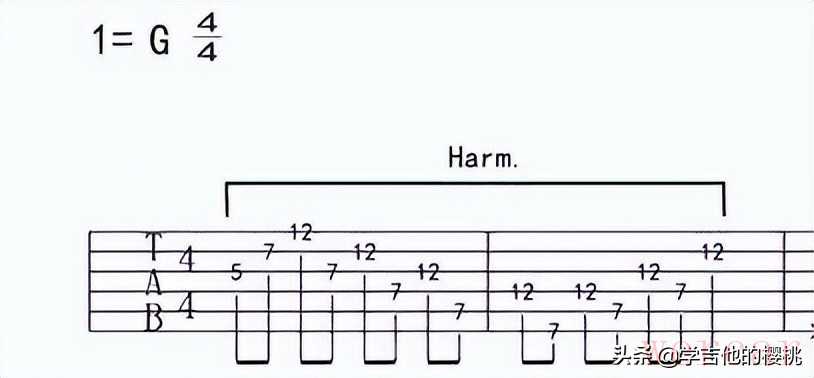 自然泛音:空弦音为基音产生的泛音叫做自然泛音。在吉他的三、四、五、七、十二品叫做自然泛音点。在乐谱上标记是:Harm。