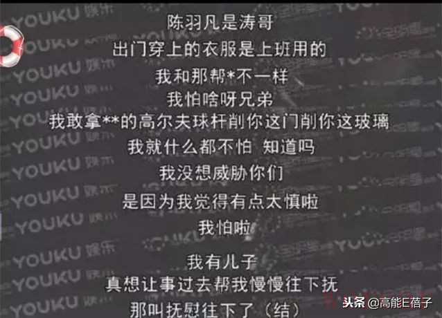 ““我敢拿高尔夫球削你的脑门削你的玻璃,我就什么都不怕,我没想威胁你们,是因为我觉得有点太瘆啦,我怕啦,我有儿子,我有儿子好吗,真想让事过去帮我慢慢往下抚。我为人处世那么多年,没丫白百何我没有脏身。”