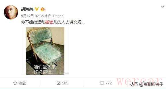 12日凌晨,胡海泉疑似针对全明星探的声明作回应:“你不能指望和碰瓷儿的人去讲交规。”力挺兄弟陈羽凡。