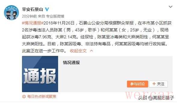 平安石景山发布微博称一个43岁歌手陈某某涉毒,而平安北京发微博用了“最美”的歌词,暗示很明显。