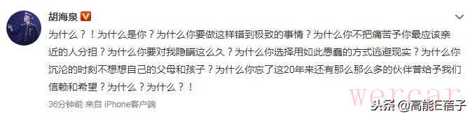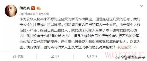 2月15日,胡海泉在微博道歉,称给爱人和孩子带来了伤害。