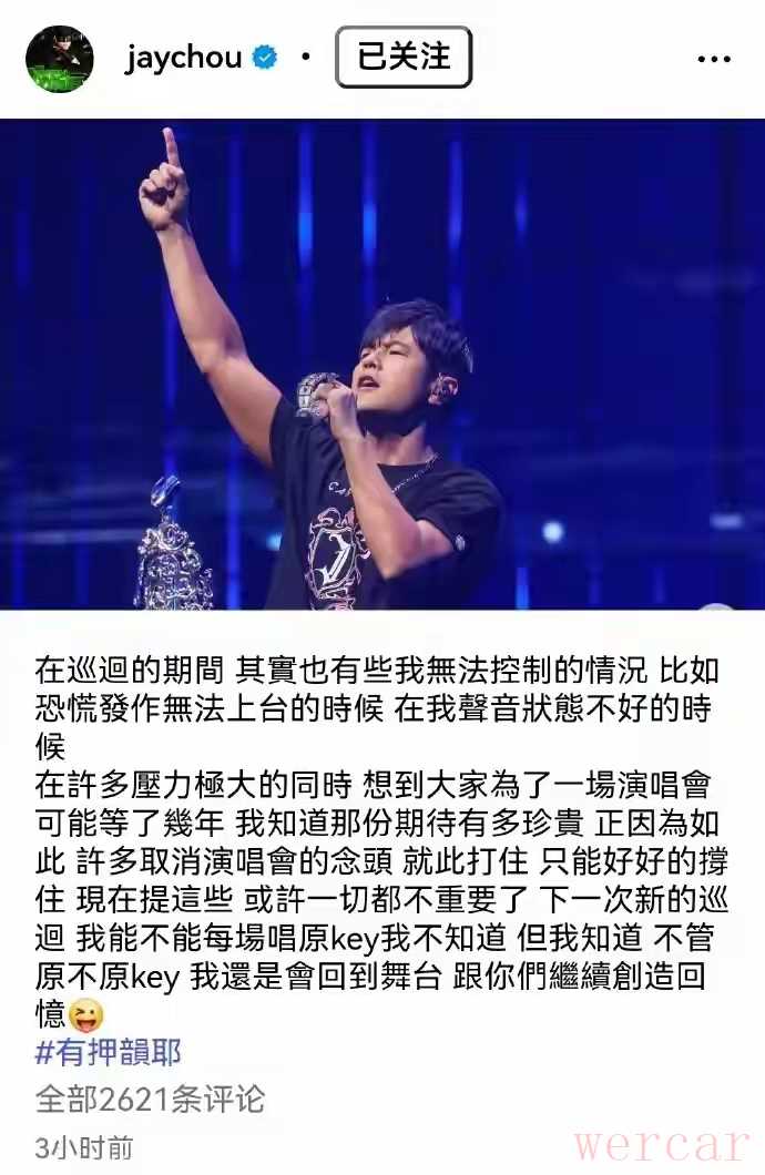 2025年10月巡演收官后,周杰伦发文表示:“下一次新的巡回,我能不能每场唱原key我不知道。但我知道,不管原不原key,我还是会回到舞台跟你们继续创造回忆。” 这种对音乐的热爱与责任感,令无数粉丝动容。