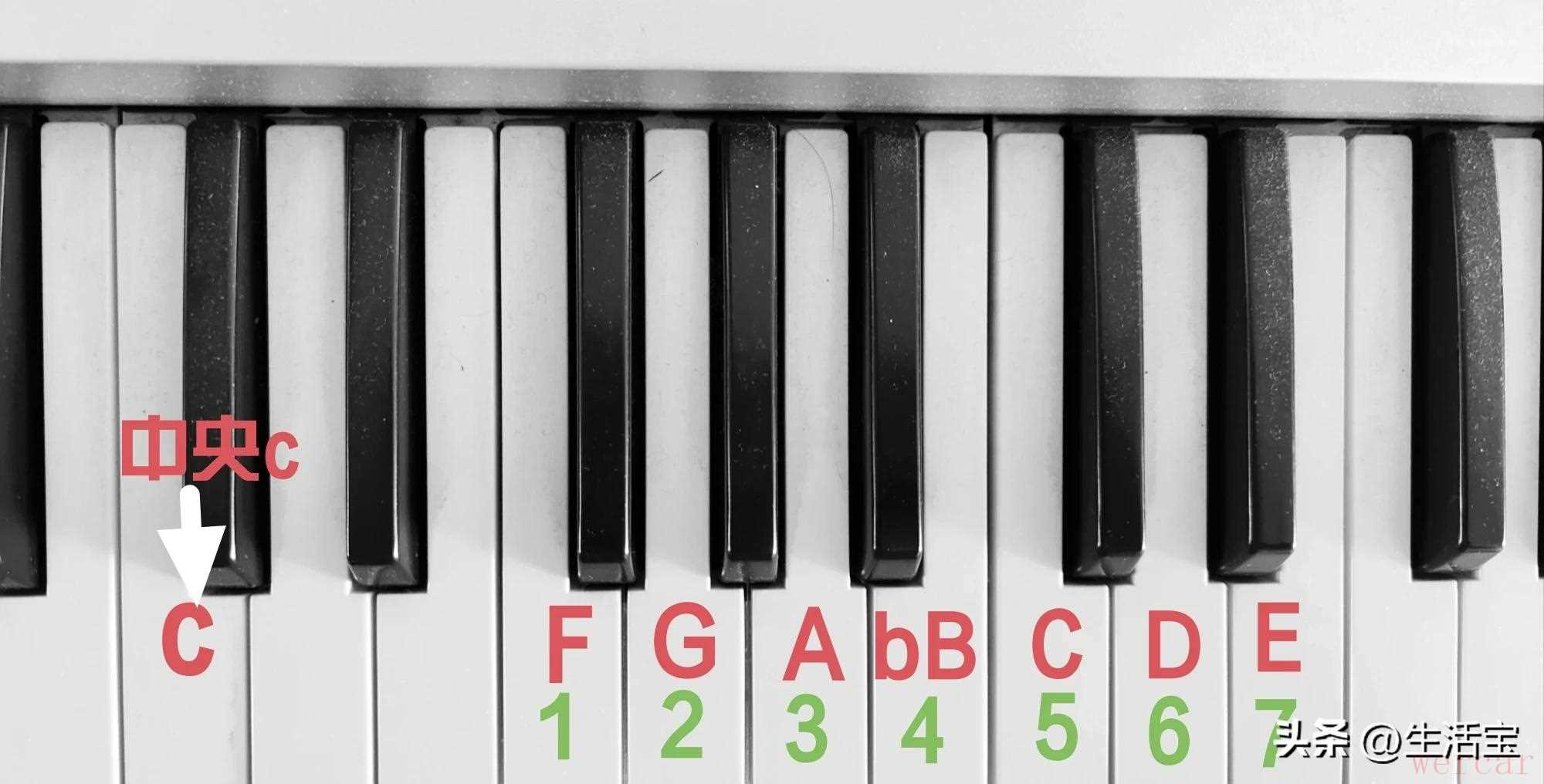 在这个音阶里,所有音符都弹奏白键,包括FGACDE,唯有音符4不能弹奏白键B,而是要弹奏相应的黑键,也就是bB键。