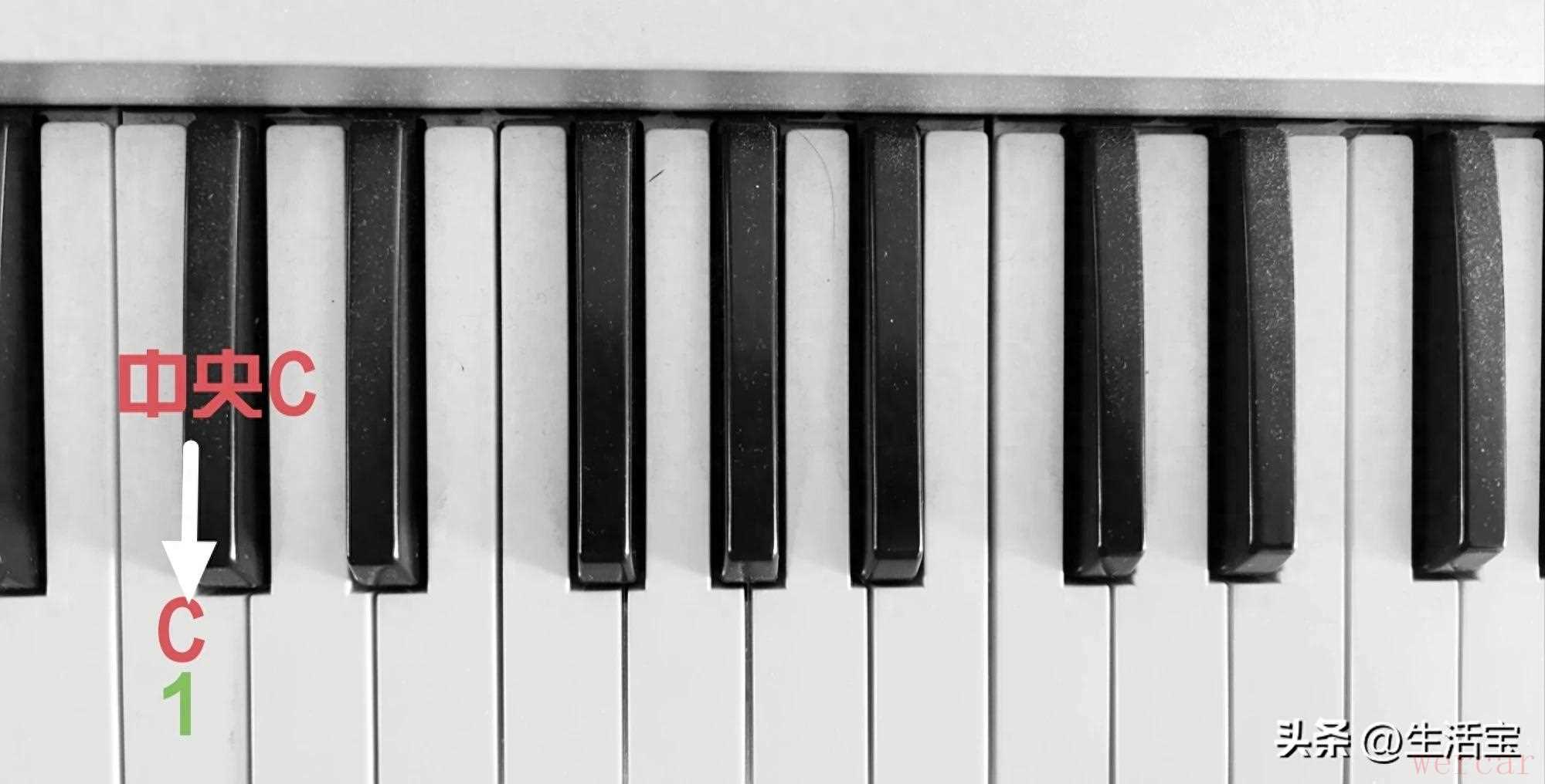 一般的乐器都有一个默认调,又称为基本调。拿钢琴来说,默认调是C调,只弹奏白键,不弹奏黑键,这样弹奏起来比较简单、容易,初学者都是从C调开始学习钢琴的。此时,调号是1=C,意思是说,当你要弹奏音符1时,只需弹奏C键,比如中央C,如图1所示。