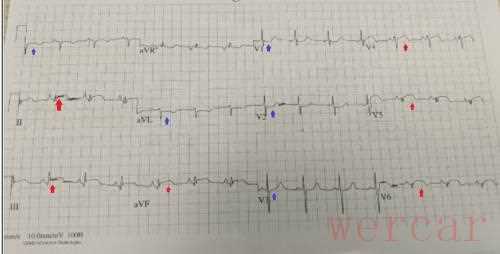 心电图(ECG):V4-V6、II、III和AVF导联ST段抬高,V1-V3、I和AVL导联ST段相对压低(图1)。