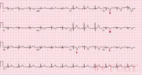 停用华法林和阿司匹林,患者谨慎地开始服用利伐沙班和氯吡格雷(双重疗法)。冠状动脉介入治疗后做的心电图显示持续的V4-V6导联T波倒置(图4)。