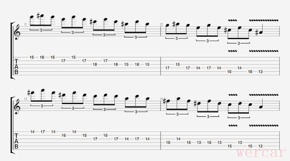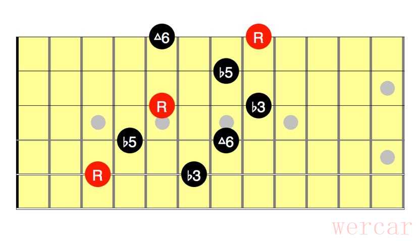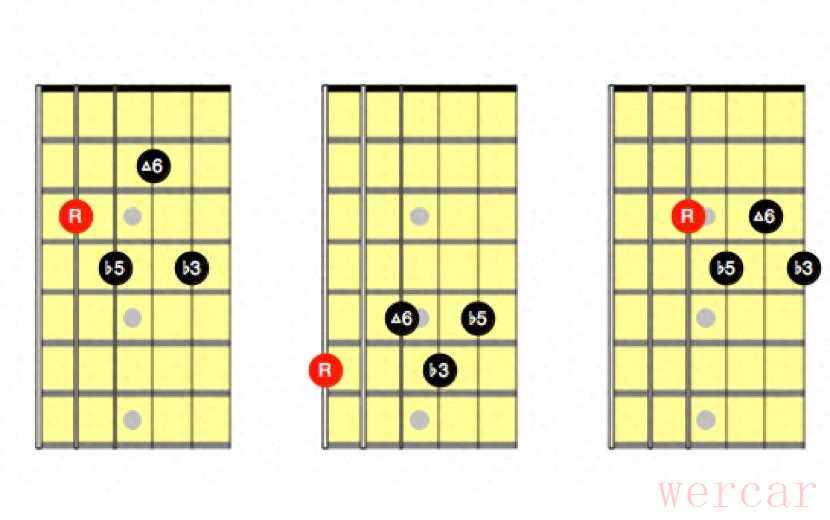 四 减七和弦琶音我们除了对之前的指型进行分解和弦外,我们还有一种非常常见的琶音指型: