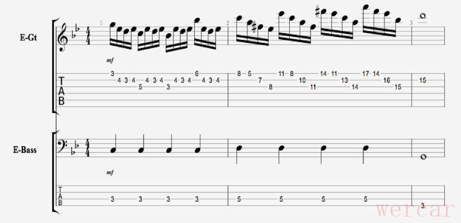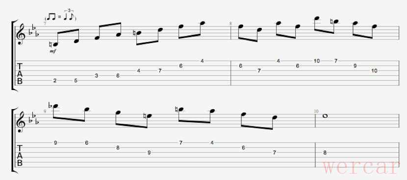 2 爵士乐同样的方法不仅可以使用在金属乐里,我们在爵士乐中也可以使用。这是一个C小调里变化的ii V i和声进行-iio7, V7b9, #io7 Viio7, i-7,即Do7, G7b9, C#o7, Bo7, C-7我们在Do7,C#o7, Bo7都演奏原本和弦的琶音,在G7b9里演奏从F减七和弦琶音