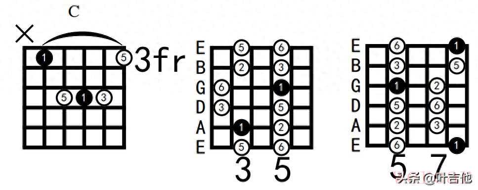 首先我们也是来熟悉A指型的C和弦指法,是不是感觉很绕口,其实就是A和弦像右手的方向移动了三品而已,如下图左一。