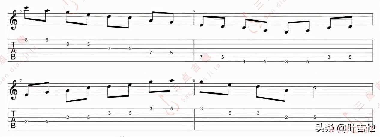 上图中间的音阶指型是建立在A指型基础上的五声音阶,有图的音阶指型是我们借用的隔壁一个五声音阶指法,也就是G指型五声音阶指法。