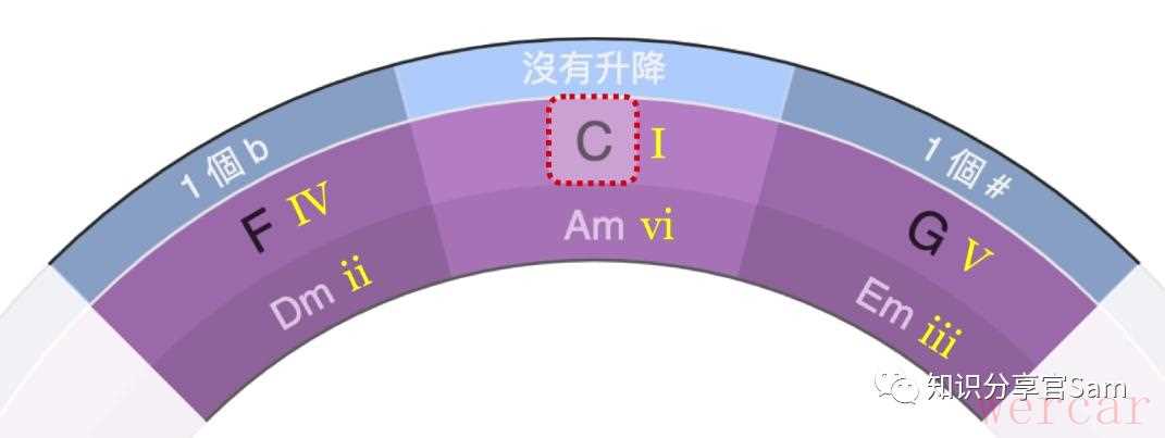 内圈为小调,小调的写法为小写字母,例如a小调、e小调。记忆秘籍:外圈大调顺时针数4个即为内圈小调,例如C大调顺时针数4个为A,所以内圈为它的关系调a小调。3)五度圈与和弦