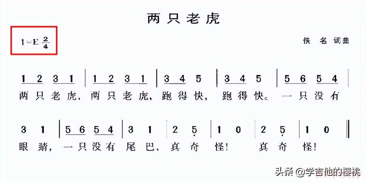 大家可以看到这里左上方的1=E,代表1音符对应的是E,2/4第一个2表示每小节两拍,第二个4表示以四分音符为一拍.