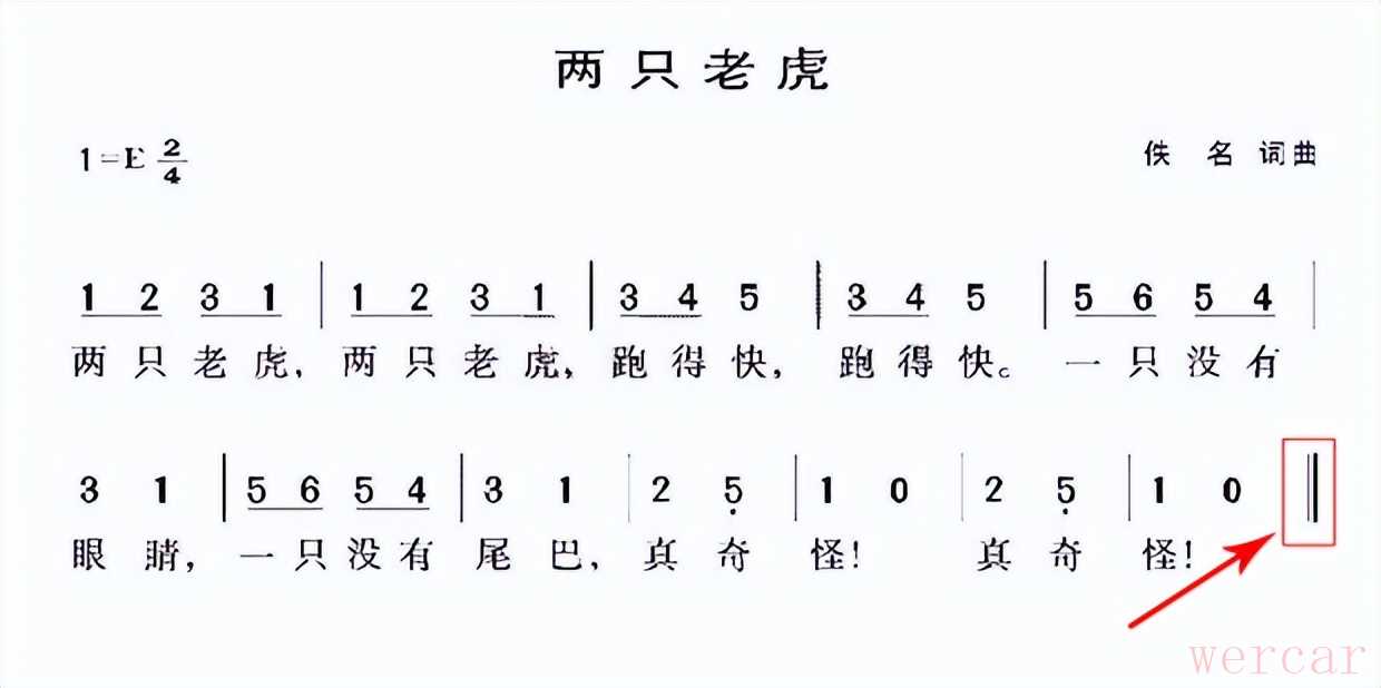 然后就是一些基本常识,比如这个谱子中最后两个竖线表示这一段结束,从下一段重新开始。