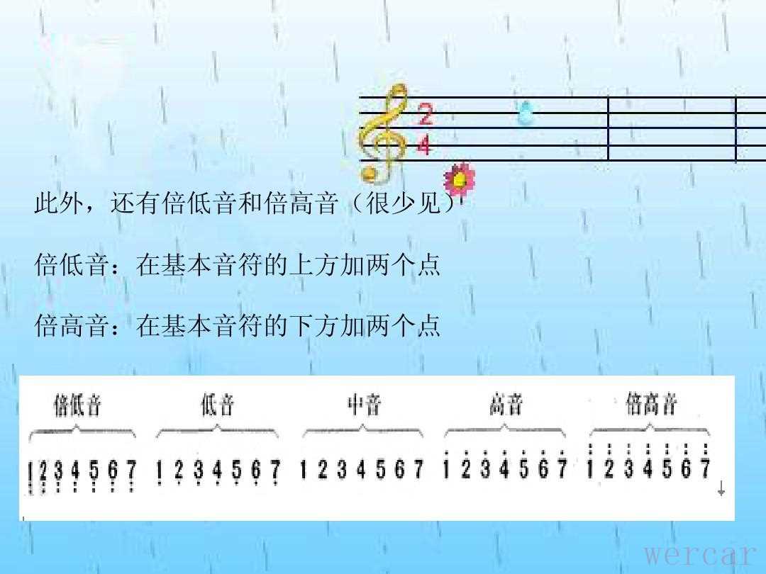 1,2,3,4,5,6,7这七个音符称之为中音,在它们上面各加一个圆点称为高音,在它们下面各加一个圆点称为低音。高音,中音,低音都是常用音符。此外还有倍高音(在中音音符上加两个点)、超高音(在中音音符上加三个点)、最高音(在中音音符上加四个点)、倍低音(在中音音符下加两个点)、超低音(在中音音符下加三个点)、最低音(在中音音符下加四个点)。