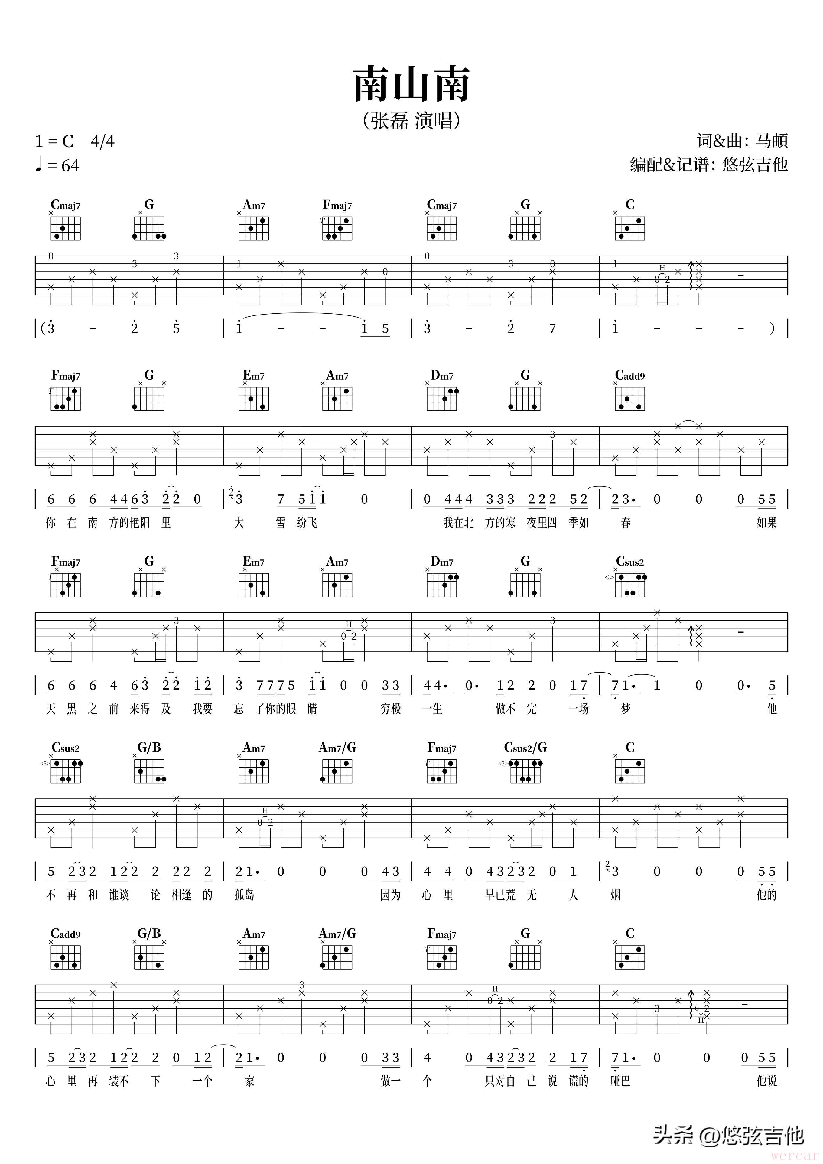 相比马頔的版本,张磊的版本中做了一定的精简,编曲也更为简洁,取消了中间的一段有些莫名其妙的插入式间奏,所以我是按照张磊的版本进行的编配,这样更适合吉他弹唱。