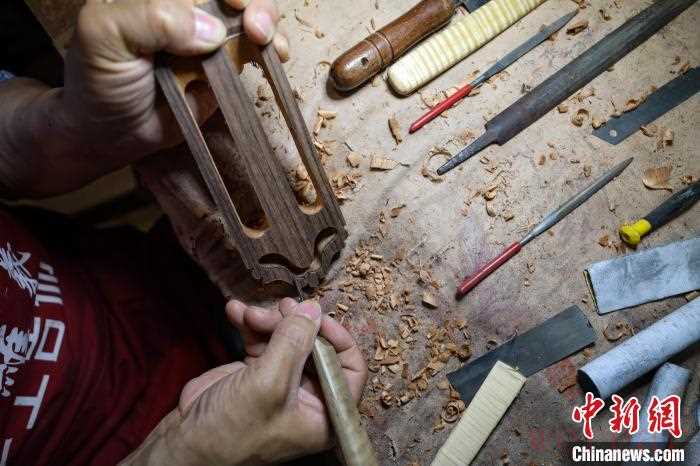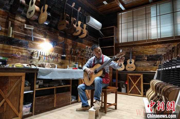 6月4日,张维义在修整吉他琴头。 瞿宏伦 摄