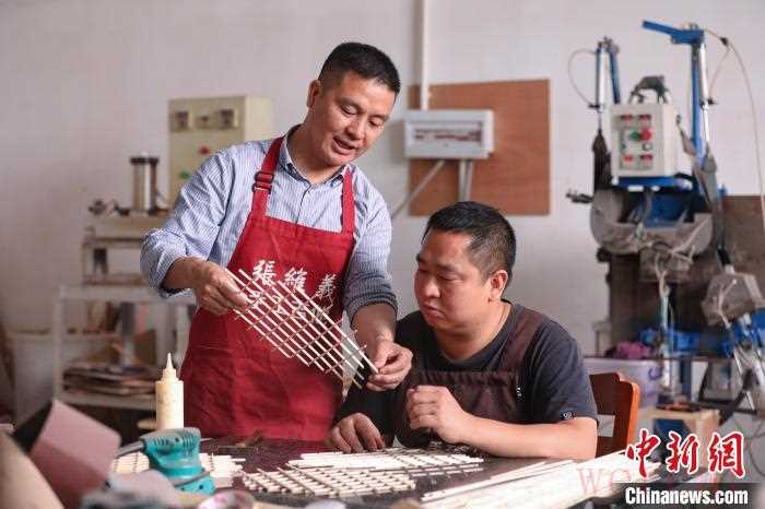6月4日,张维义(左)在和工作室成员探讨吉他面板音梁制作细节。 瞿宏伦 摄