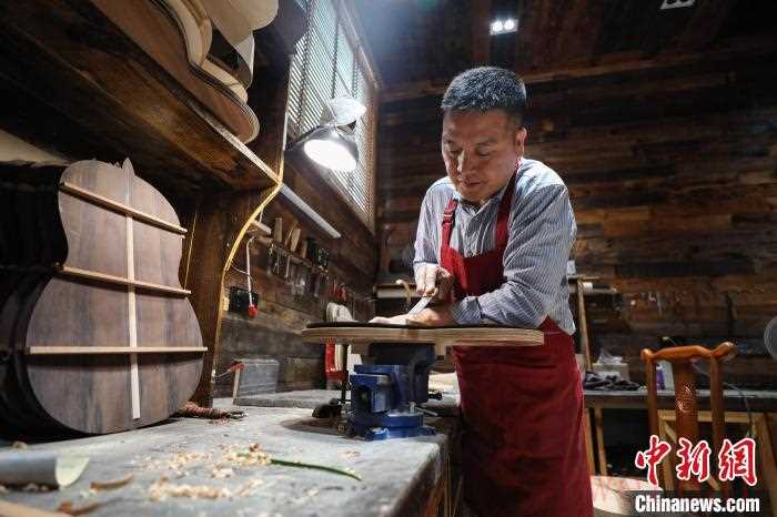 6月4日,张维义在修整吉他底板音梁。 瞿宏伦 摄