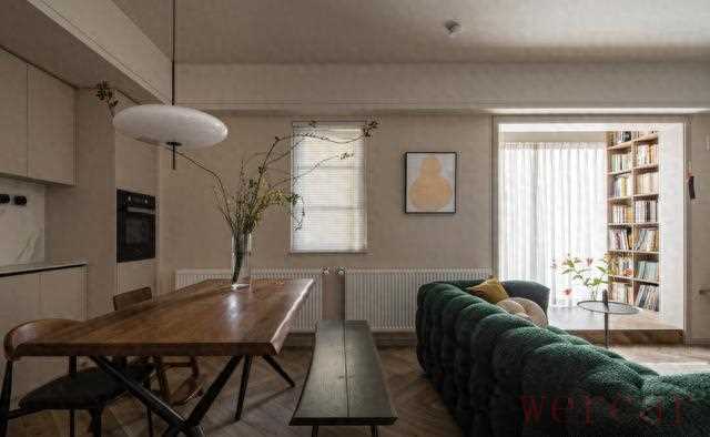 横厅改竖厅才是神来之笔。原户型沙发只能横在过道,电视一摆,娃跑都嫌挤。设计师把阳台一封,地面抬高15公分,低成本造了个“地台阅读坑”。阳光从落地玻璃灌进来,书架贴着墙顶天,绘本、乐高、手办全排排站。晚上把投影仪一转,地台秒变家庭影院,沙发后移30厘米,十个人吃火锅都不挤——茶几挪走就是长桌,谁还额外买餐厅?