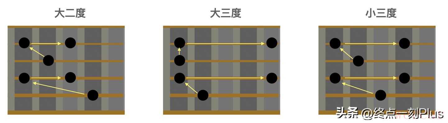 琶音与分解和弦的最大区别是组成音可以无节奏限制地按顺序依次奏出,通常用于快速、流畅的旋律或和声部分,而分解和弦是组成音按一定节奏地自由排列奏出,用于强调和声的情况。另外,琶音与音阶的最大区别是音阶是调式内音上下行奏出,可以产生旋律效果,而琶音是和弦内音上下行奏出,可以产生和声效果。在吉他上弹琶音对提高手指的灵活度、对指板音程和音阶的熟悉程度以及对和弦的构建有非常大的帮助,是即兴solo必须掌握的基本功,可以累积为即兴的素材。因为琶音是和弦分解的一种,因此通常在和弦进行时弹对应和弦的琶音是毫无违和感的,如大三和弦、小三和弦对应大小三和弦琶音,大七和弦、小七和弦、属七和弦对应3种七和弦琶音。那么,如何在吉他上练习琶音呢?因为吉他指板上有很多相同的音名,和音阶一样,琶音有对应的多种练习指型,只要符合音程关系就可以作为琶音的指型路线。通常我们会选择利于手指灵活弹奏的指型。根据CAGED系统原理,每个和弦都有5个指型,因此我们可以根据CAGED系统来总结出每个和弦的5个琶音指型。如果你还不了解CAGED系统,可以看下以下链接:【吉他干货】有这个和弦音阶“导航定位”系统,从此再也不迷航!另外,很重要的一点,“根、三、五、七”内音之间的音程关系由大三度或小三度构成,两个“根、三、五”音衔接处的“五->根”是纯四度关系,两个“根、三、五、七”音衔接处的“七->根”是大二度或小二度关系,纯四度和小二度在指板上很简单,纯四度是上行相邻两弦,小二度是同弦相邻两品,即是说我们牢记大二度、大三度和小三度在指板上的形状就很容易推出琶音路径图,关于音程关系请看:【吉他干货】秒懂音程的奥秘,快来看看!(下)!大二度和大小三度分别在指板的两种形状图如下(注意在3弦和2弦时的变化):