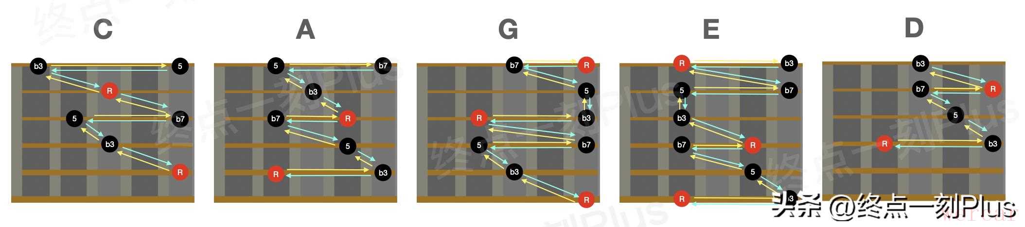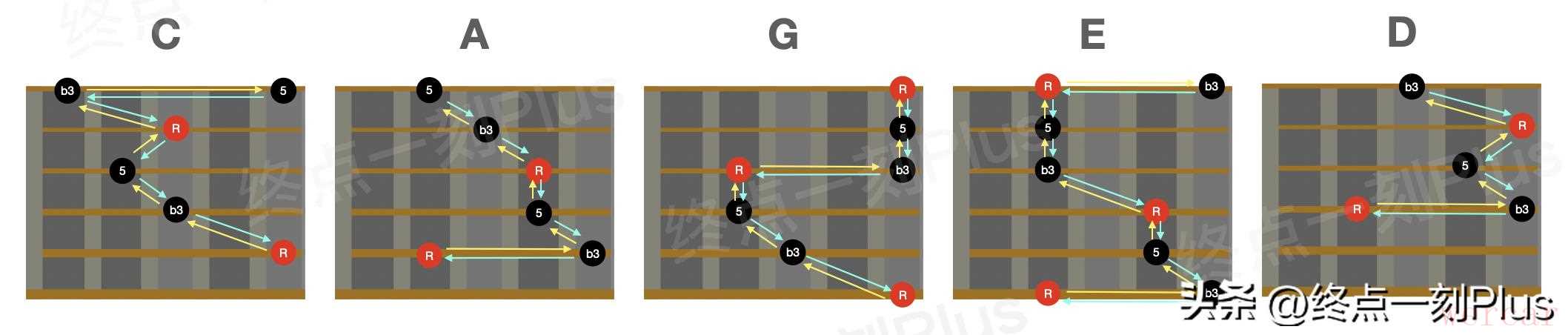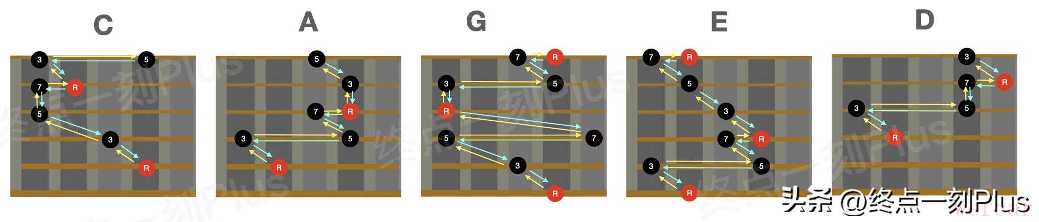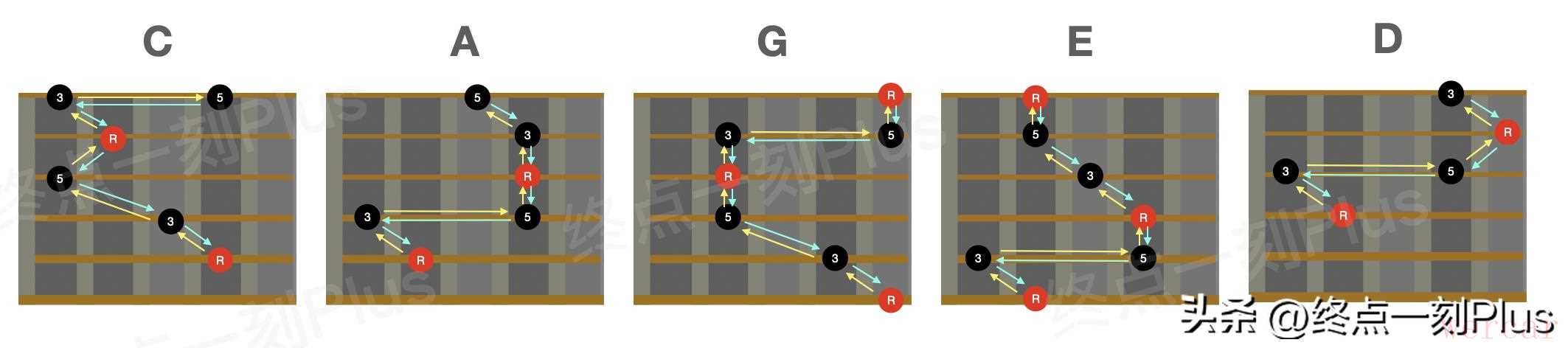 以上就是和弦琶音根据CAGED系统得到的5个琶音指型,其实并不仅有这5个指型,每个指型还可以按照以根音为中心的“左中右”3个指型,大家可以在逐步按这两个思路来熟悉琶音路径,刚开始练习时可以选择一个指型重点练习即可。当然,练习琶音除了左手指型,还需要结合右手的节奏来匹配才能得到更加丰富和自然的效果,练习琶音只是即兴的基本功,练习时应由慢速开始,将每个音都弹准确和连贯,然后结合和弦进行以及节奏来完成每个和弦的琶音弹奏。好了,今天的分享就到这里。如果觉得有收获,请【点赞+关注+收藏】支持下吧!如果你有什么疑问或者发现文中有描述错误的地方,记得在评论区交流下哦~