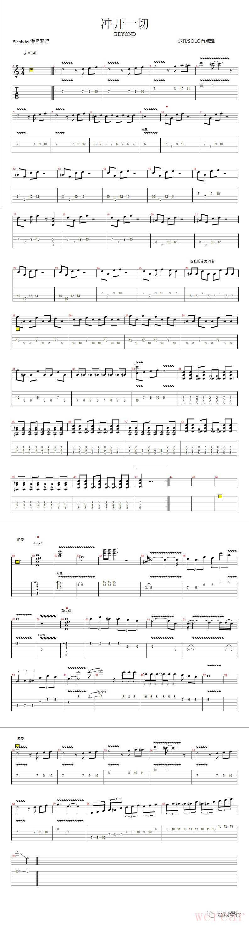 这是一份根据Beyond《冲开一切》主音吉他SOLO部分的简化版谱例,使用六线谱(Tablature)表示。请注意,这并非官方精确版本,而是根据歌曲录音和常见演奏方式整理的指法提示,可能存在细微出入,需要根据实际听感和吉他手习惯进行调整。
