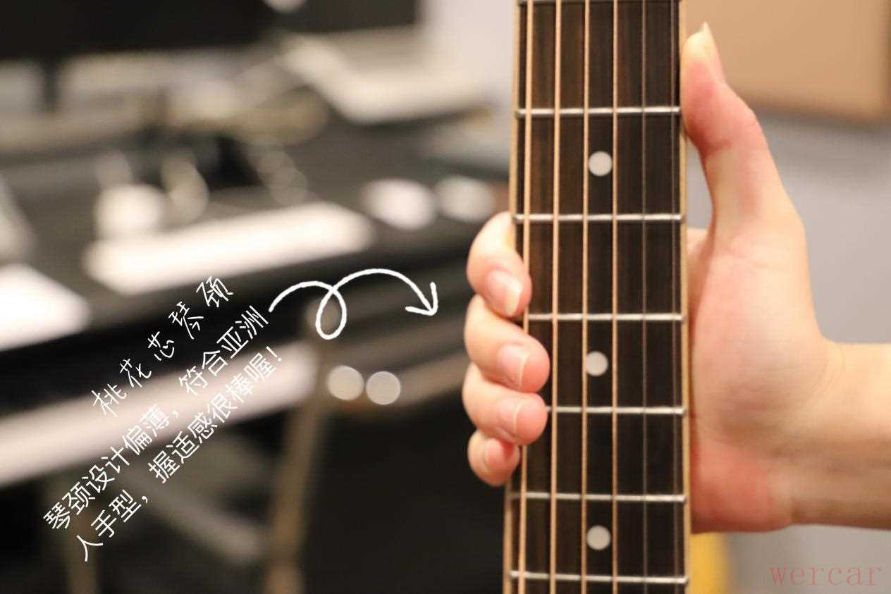 加上琴身西堤卡云杉单板,整个吉他的触感很有档次。初次拿到这把吉他,我几乎不用调节,即可现场演奏。吉他所有的琴弦、按键、旋钮的质量都相对较好。