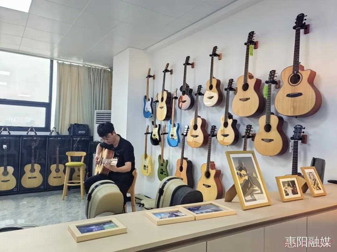 走进汤姆乐器的现代化生产车间,工人们正有条不紊地忙碌着,一件件精美的乐器从这里诞生。据汤姆乐器负责人谢宝舰介绍,公司成立至今已有12年,扎根惠阳秋长街道,这里完善的政策、配套设施以及丰富的产业功能,为企业的发展提供了坚实的基础。“整个秋长的原物料采购和产业功能都非常完善,这对我们乐器行业来说,是极大的优势,也让我们在招工方面十分顺利。”谢宝舰说道。汤姆乐器的破圈之路,始于“吉他+艺术”的创新联名生产模式。公司先后取得世界著名画家梵高的画作、日本动漫熊本熊、比卡丘形象等作品的独家版权,将艺术元素巧妙融入乐器生产中。这种跨界合作不仅赋予了乐器独特的文化内涵,也吸引了众多不同领域的消费者,成功实现行业破圈。“我们在2016年就开始尝试跨界合作,从与明星合作,到推出博物馆系列、动漫系列产品,就是希望在传统产品基础上注入文化元素,这对产品销售有很大帮助。”谢宝舰表示。