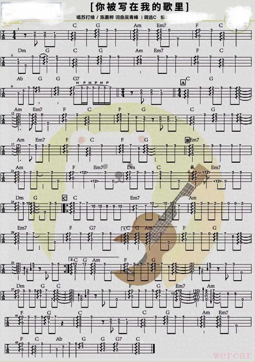 吴青峰你被写在我的歌里曲谱大揭秘,尤克里里指弹谱教程来袭