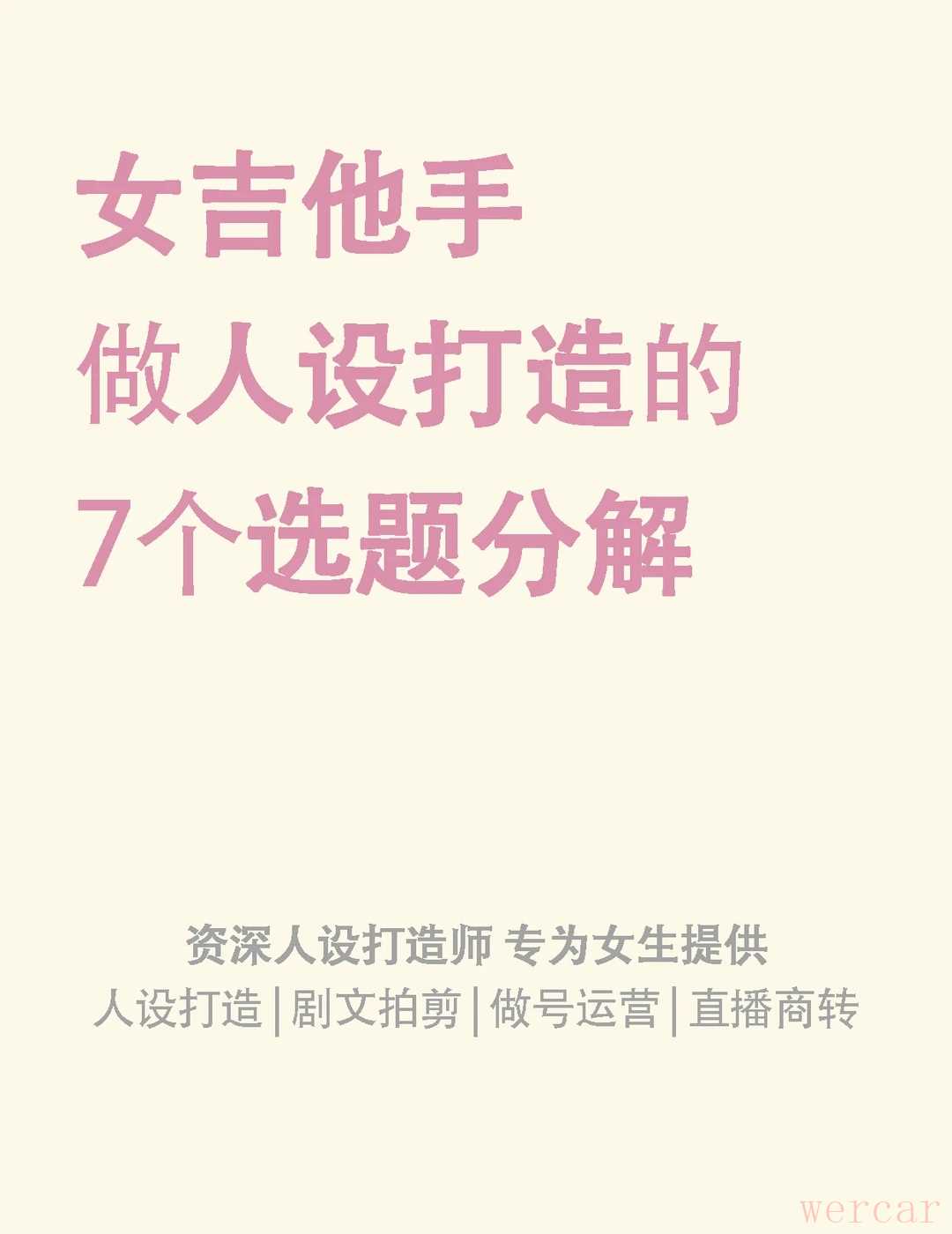 这里为打造女吉他手的人设提供7个选题分解,每个选题都包含不同的侧重点,可以帮助你更立体地构建形象: