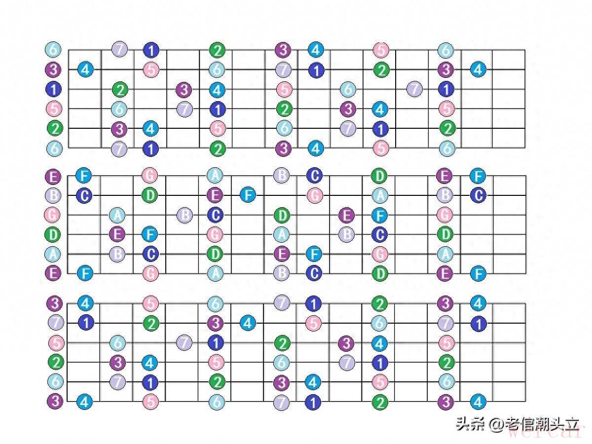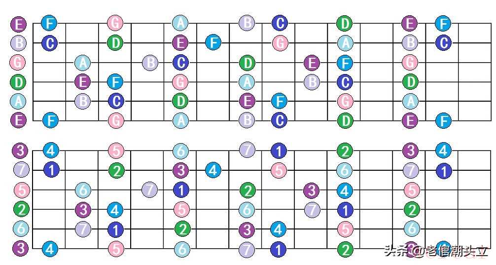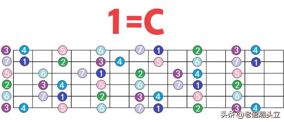 吉他C调前三品,搞时白了,就是吉他上一个很小区域的局部地图,靠着这张局部地图,在有限的区域逛逛,但再好的地方逛多了也会慢慢失去兴趣、热情,这时总想着去更大的地方逛。这时就需要一张更多区域的地图。下面这张图,就是我们玩吉他的大地图。