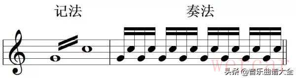 (7)震音记号,斜线表示震音的速度,一根表示八分音符、两根表示十六分音符,以此类推。