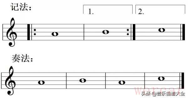 (2)带不同结尾的反复记号,第一遍演奏第一结尾,第二遍跳过第一结尾直接演奏第二结尾。