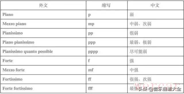 (1)固定力度记号,由弱到强排列: