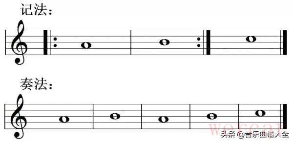 (1)反复记号,如果从头反复也可以不写前面的复纵线加小圆点。