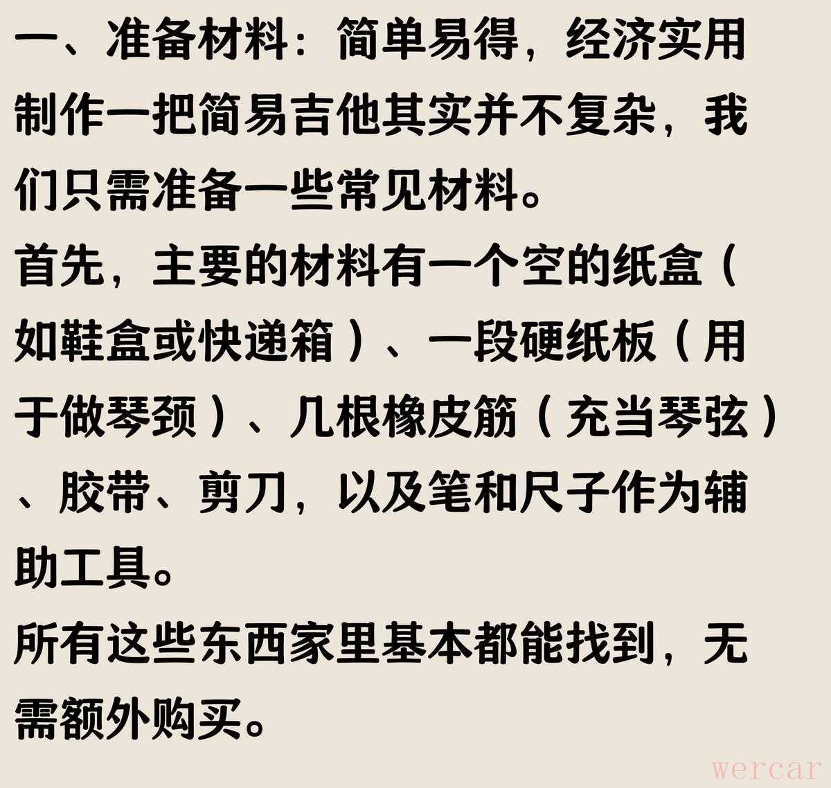 这是一个制作简易吉他的基础教程,适合初学者动手尝试。这个简易吉他主要利用常见的材料,重点在于学习制作的基本流程和原理,成品可能无法达到专业音质,但绝对可以弹奏并带来乐趣。