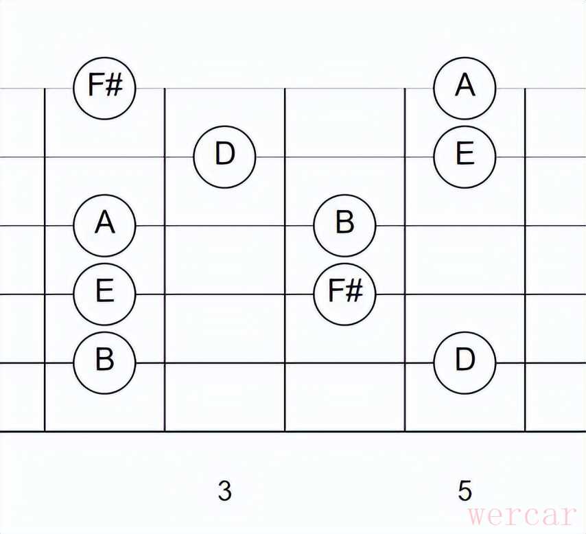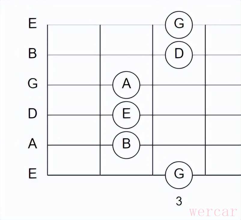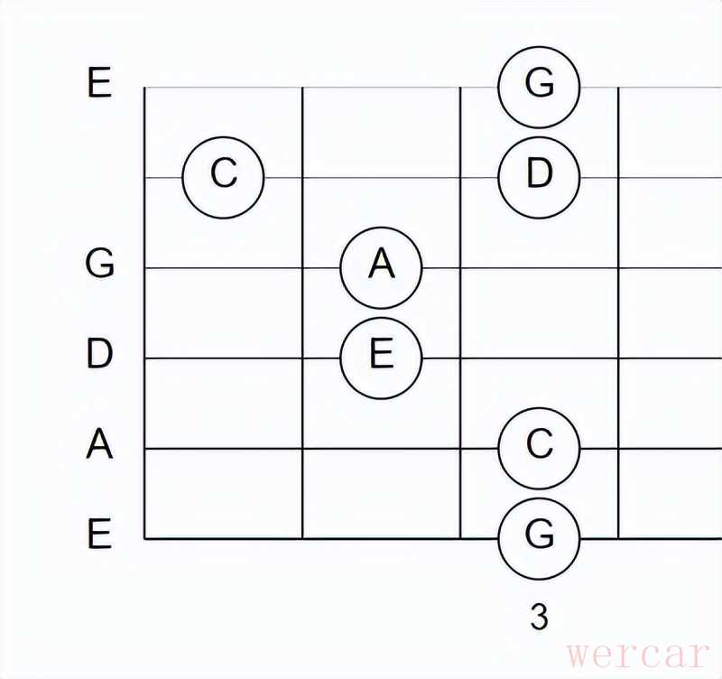 从这个图可以看到G和弦和Em和弦,这能按出这两和弦基本就把这个指形的五声音阶掌握。然后按照CAGED系统往高把位上移就可以解锁更多的五声音阶。