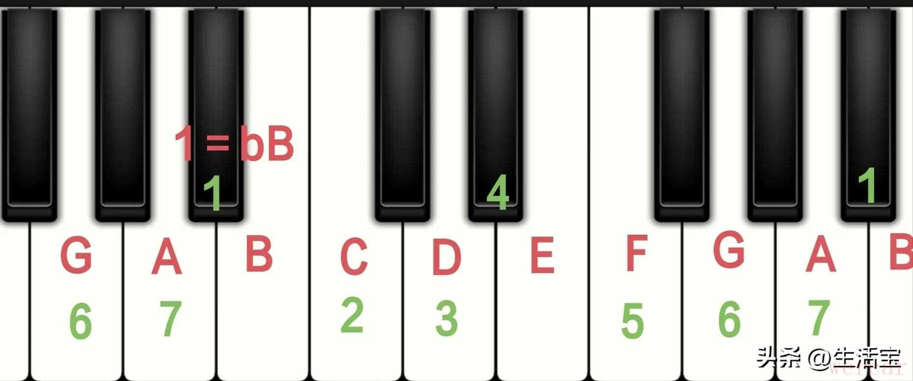 第一,了解bB调的键盘图。先来看看bB调的键盘图,以便了解bG调的音阶,如图所示。