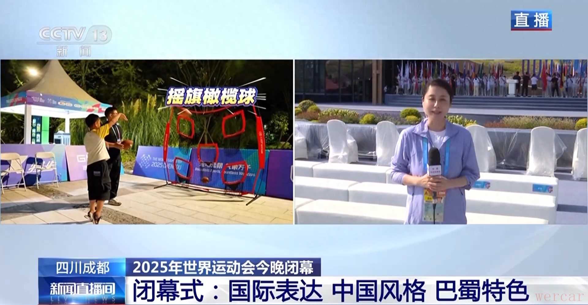 总台央视记者 韩冰:此刻我就在成都世运会闭幕式的核心区域。这个核心区域从空中鸟瞰是由三片花瓣造型组成的,在我的右手边的这两片花瓣,是参加本届世运会的各国运动员落座区域,左手边是媒体和嘉宾的区域。在我身后就是本届世运会闭幕式活动的主舞台。由于整个场地是依山而建,大家可以看到,身后的一级一级的台阶,看上去非常有层次。在闭幕式的现场,我们的旗手、参与演出的志愿者们就会从山上顺着台阶来到主舞台中央,和大家互动。