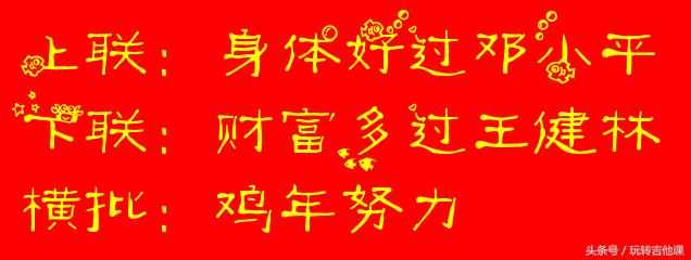 今天大年初二,继续给大家拜年!祝福“玩转吉他课”的粉丝朋友们鸡年发大财,身体更健康!还是那个标配,还是那个对联: