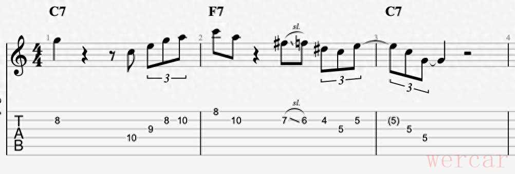 首先在C7和弦上演奏了C大调布鲁斯音阶,随后围绕F7和弦加入了F及Eb音,最终在C7和弦上以E、C、G琶音收尾。