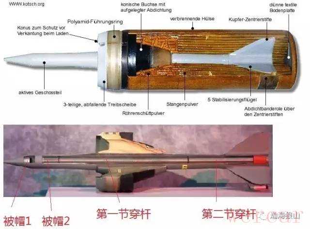 3BM42的主发射药使用Zh63,弹丸编号是BM44。BM42的最大特点在于,钢套下包覆的钨合金穿甲杆是分成两段的,两段穿杆之间是没有使用任何物理手段进行连接。一节长270mm,一节长150mm,总长420mm,直径仅有18mm。这样小的穿甲体,其质量不到2千克!钢套穿甲弹中钢制的部分,只是包覆内部重合金穿甲体的“外皮”,发挥不了什么侵彻作用。