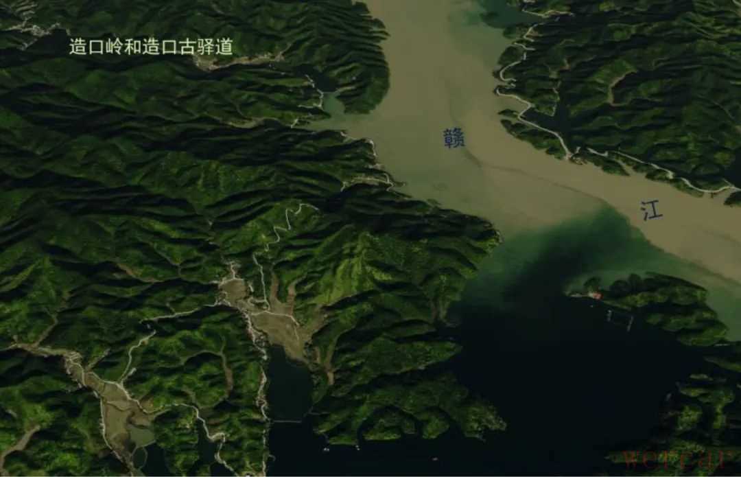 杨万里过造口,在辛弃疾离赣州后四年,可谓前脚跟后脚。杨万里所称地名为皂口,可见当时已经是造口、皂口混用。杨万里前诗说,皂口驿,条件非常差,屋舍破旧不堪。后诗表明:这里有一处渡口,由水路转陆路,“夜渡”赣江“惊滩”,天明后走陆路,翻越造口山岭,前往赣州;山岭的驿道很陡峭,需要攀登陡峭的石阶“绝蹬”;驿道弯曲如九羊肠。明代邓云霄也有《皂口问渡》和《乌兜夜雨》诗说:“高滩问渡处,何异斗边槎。”“问津才皂口,旅宿又乌兜。落叶迷官路,流云锁驿楼。”郭谏臣《午过皂口驿》也有“肩舆度危岭,雨歇众峰青”云云,可见明代延续宋代设置,造口既是津渡,也是水路陆路转接的驿站。我们用Google 地球实测,造口岭山道最高处海拔210米,赣江江面海拔89米,水淹约30米,故宋代当年造口岭的相对高度为210-89+30=151米(参图2)。而Google 卫星图显示的造口岭上的道路(应是当年的古驿道)确如九回羊肠,蜿蜒曲折(参图3)。夜渡惊滩有底忙?晓攀绝磴更禁当。周遭碧嶂无人迹,围入青天小册方。半世功名一鸡肋,平生道路几羊肠?何时上到梅花岭,北望螺峰半点苍。
