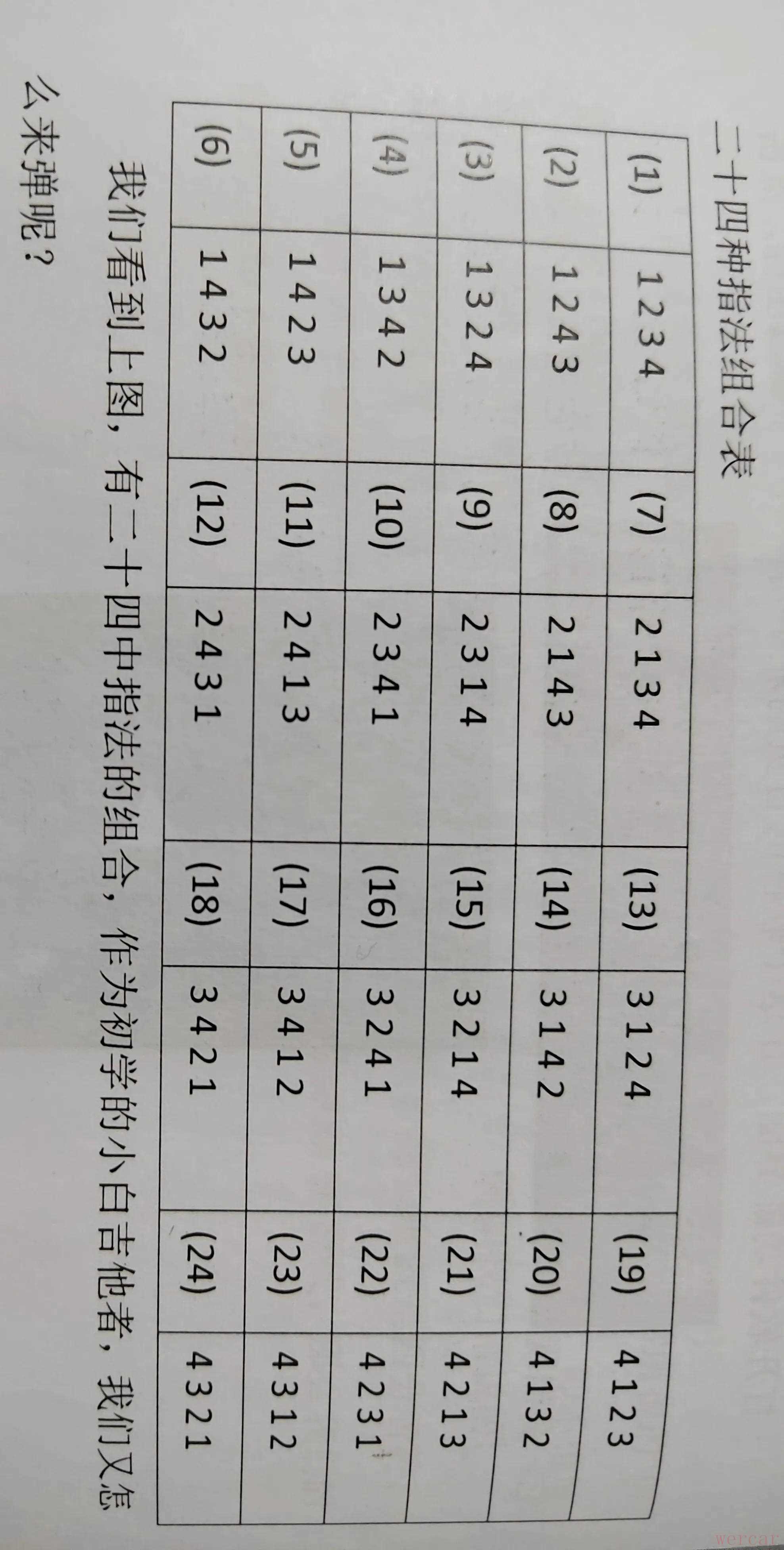 上图1—食指,2—中指,3—无名指,4—小指,T—拇指,朋友们可以清楚看到1234代表我们左手的哪一个指头,表格中的1234指的是我们手指的顺序。例如第一个指法1234代表从吉他任意一个品格开始,如果从第一弦第五品开始。